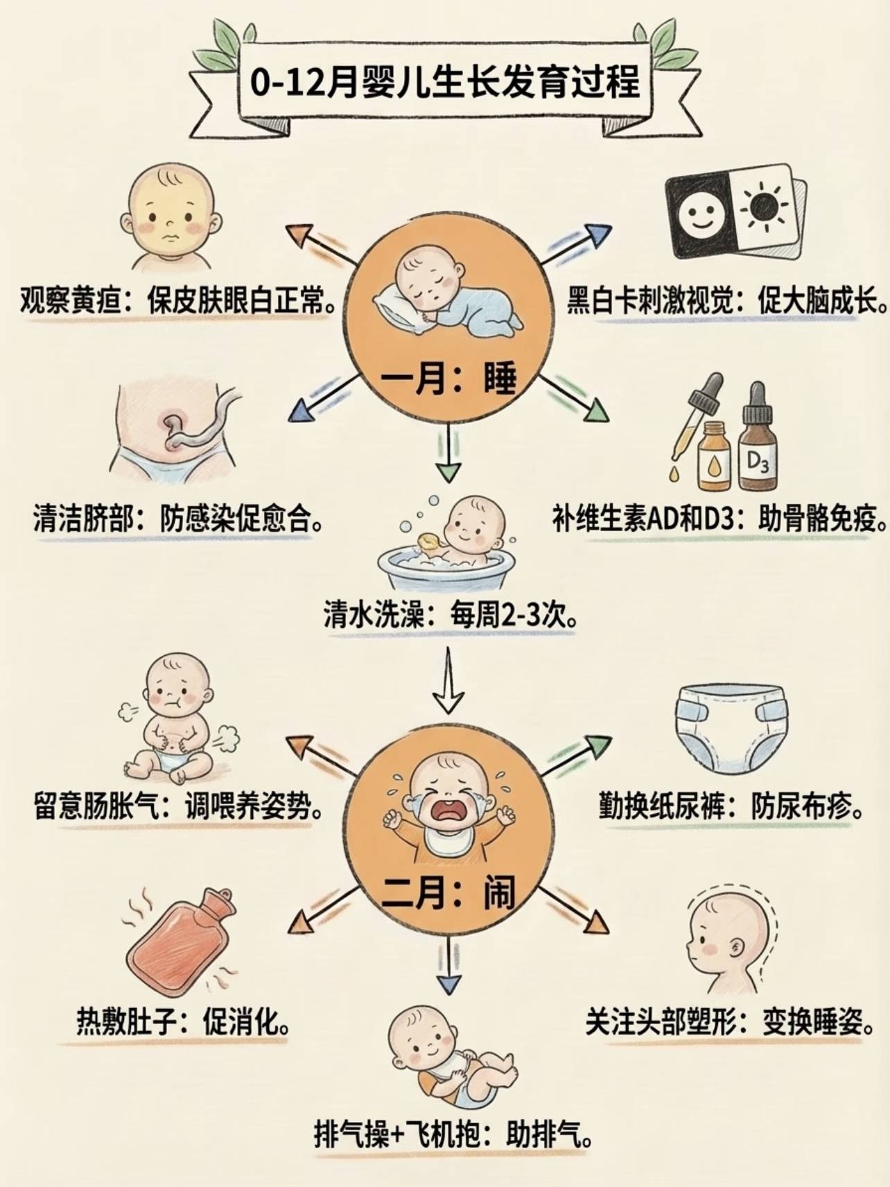 家有萌宝初降临,就像开启了一场充满惊喜与挑战的奇妙旅程,0到12个月,是宝宝飞速成长的黄金时期,每个月都有新变化,就像拆盲盒一样,让人满心期待,咱们就来唠唠这0到12月婴儿的生长发育过程,给新手爸妈们一份实用的育儿指南。 0-3个月:初来乍到的“小天使”,宝宝刚出生时,就像一颗皱巴巴的小豆芽,但别小瞧他们,这可是他们人生旅程的起点,在这个阶段,宝宝大部分时间都在睡觉,一天能睡16到20个小时呢,就像个小睡神。他们主要通过哭声来表达需求,饿了哭、尿了哭、不舒服了也哭,新手爸妈们可得学会“听声辨意”。 到了1-2个月,宝宝开始有了视觉和听觉的初步发展,他们能盯着距离眼睛20-30厘米的东西看,对黑白对比强烈的图案特别感兴趣。听到声音时,会转动小脑袋去寻找声源,这时候,爸妈们可以多和宝宝说说话,唱唱歌,用温柔的声音刺激他们的听觉发育。