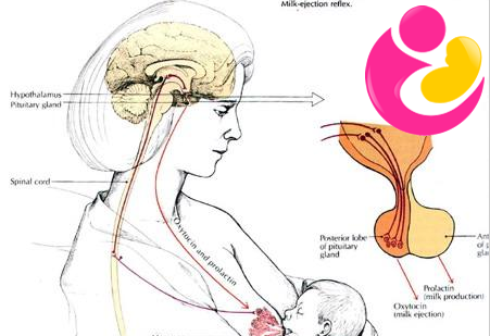 乳汁的分泌仅仅靠婴儿的吸吮是不够的,还必须有“喷乳反射”的帮助。婴儿吸吮时对乳头的刺激,通过感觉神经传达到大脑,反射性地引起垂体后叶产生催产素。催产素随血液到达乳房,使腺细胞和腺管周围的肌细胞收缩,将腺泡内的乳汁压向乳导管,到达乳窦。当婴儿吸吮乳头,双唇压迫乳晕下面的乳窦时,很容易将乳汁吸出。此时如婴儿突然松口,乳汁就像喷泉一样从乳头喷射而出。这就是“喷乳反射”。